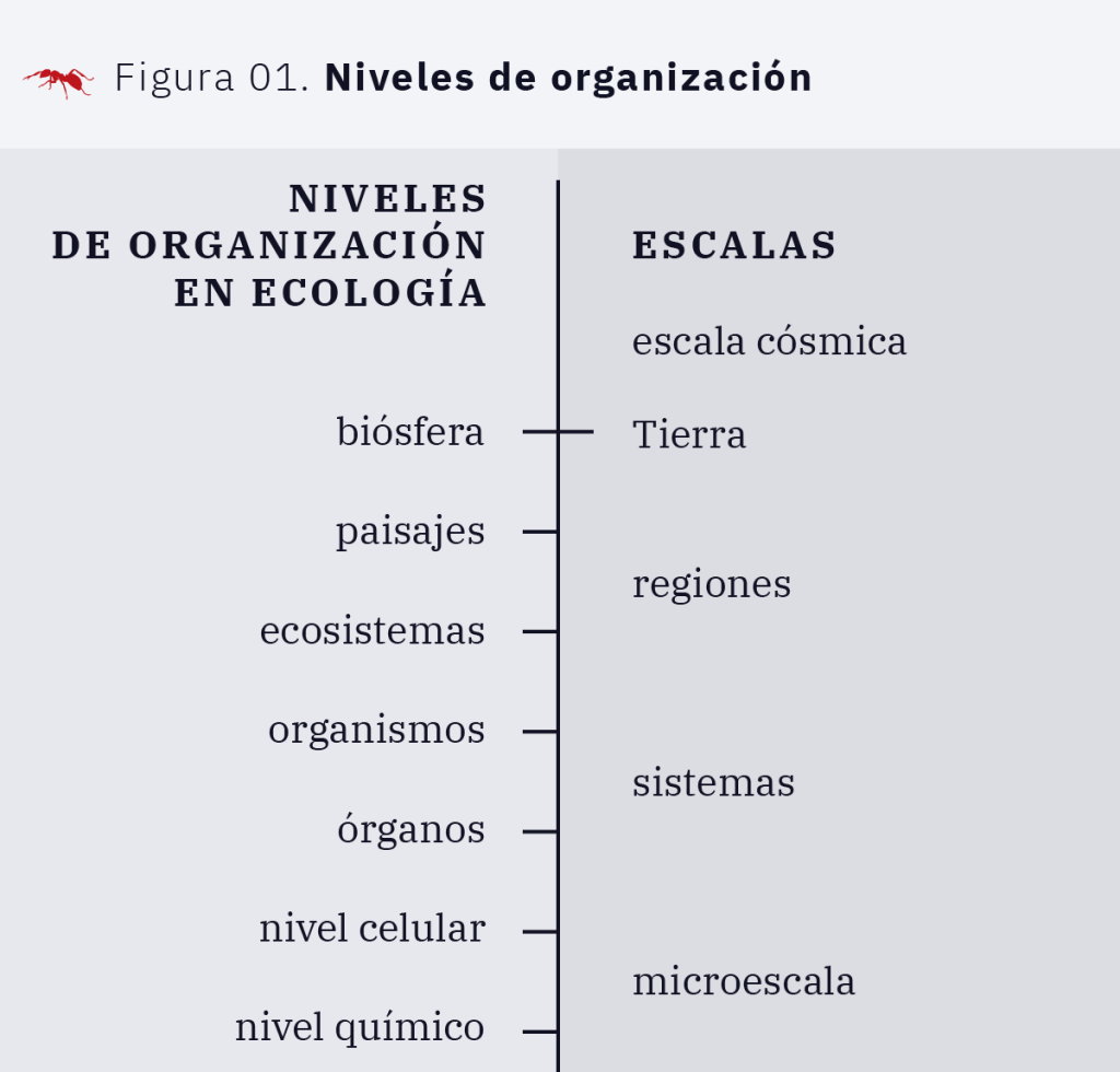 Los niveles de organización de la ecología existen en diferentes escalas, aunque una escala no sea lo mismo que un nivel de organización. Los niveles de organización se definen por los cambios cualitativos en el funcionamiento de sistemas a partir de ciertos niveles de agregación, a partir de los cuales aparecen comportamientos nuevos. Las escalas refieren a magnitudes en las cuales se pueden observar diferentes fenómenos. Para pensar un fenómeno, necesitamos, aunque sea intuitivamente, entender en qué escala actúa.