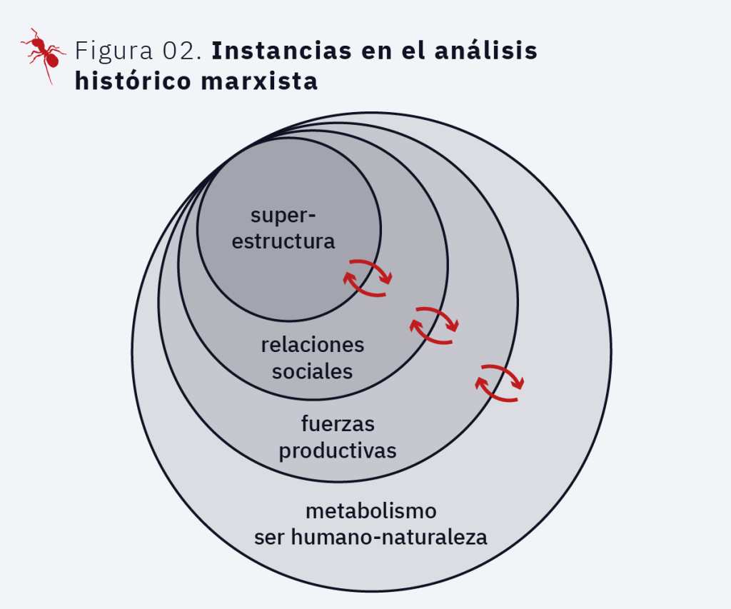 Esta forma de pensar la historia ha sido criticada por muchas razones, entre ellas la de ser un determinismo tecnológico. Una forma de mitigar este problema es agregar a este esquema, por debajo del nivel de las fuerzas productivas, siguiendo al filósofo ecomarxista John Bellamy Foster, una instancia más básica aún, la del intercambio metabólico con la naturaleza. Bellamy Foster introduce el concepto de “brecha metabólica” para hablar de la forma como el ser humano sustrae materiales de la circulación natural, perturbando distintos sistemas ecológicos. Agregado esta instancia, si mantenemos la lógica de que la determinación va de abajo hacia arriba, podemos pasar de un determinismo tecnológico a un naturalismo capaz de dialogar con la ecología.