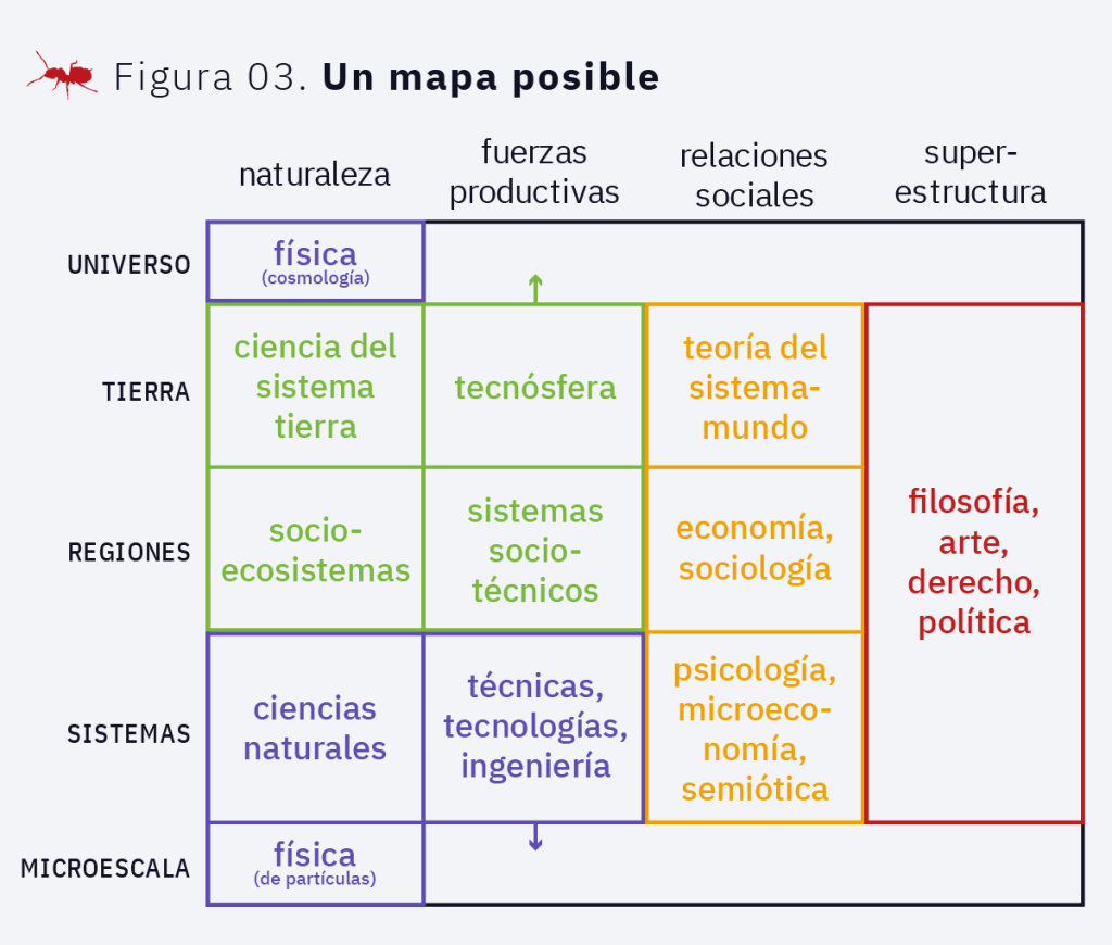 Pensar en términos de escalas y niveles de organización es un paso importante para poder pensar cómo los fenómenos pequeños son distintos pero también interrelacionados con los grandes. Pero eso no construye por sí mismos un mapa suficiente. Fundamentalmente, falta dar cuenta de la dimensión social e histórica de lo que los seres humanos hacemos y padecemos.